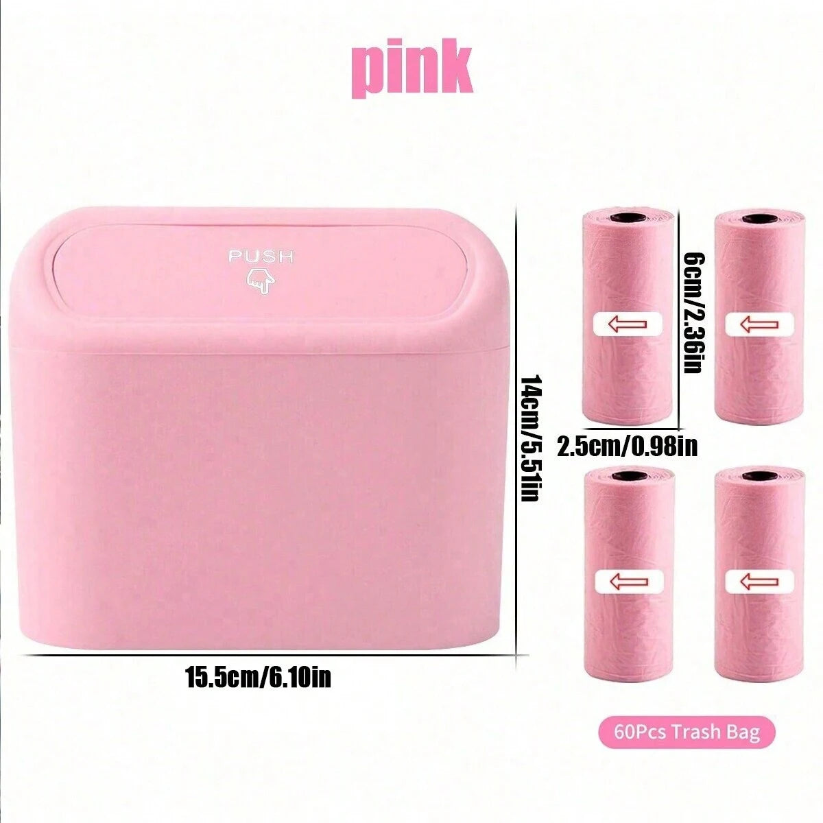 With a size of 6.1 × 5.5 × 2.6 inches, this mini trash can is small enough to fit neatly in your vehicle while still offering ample space for everyday waste.